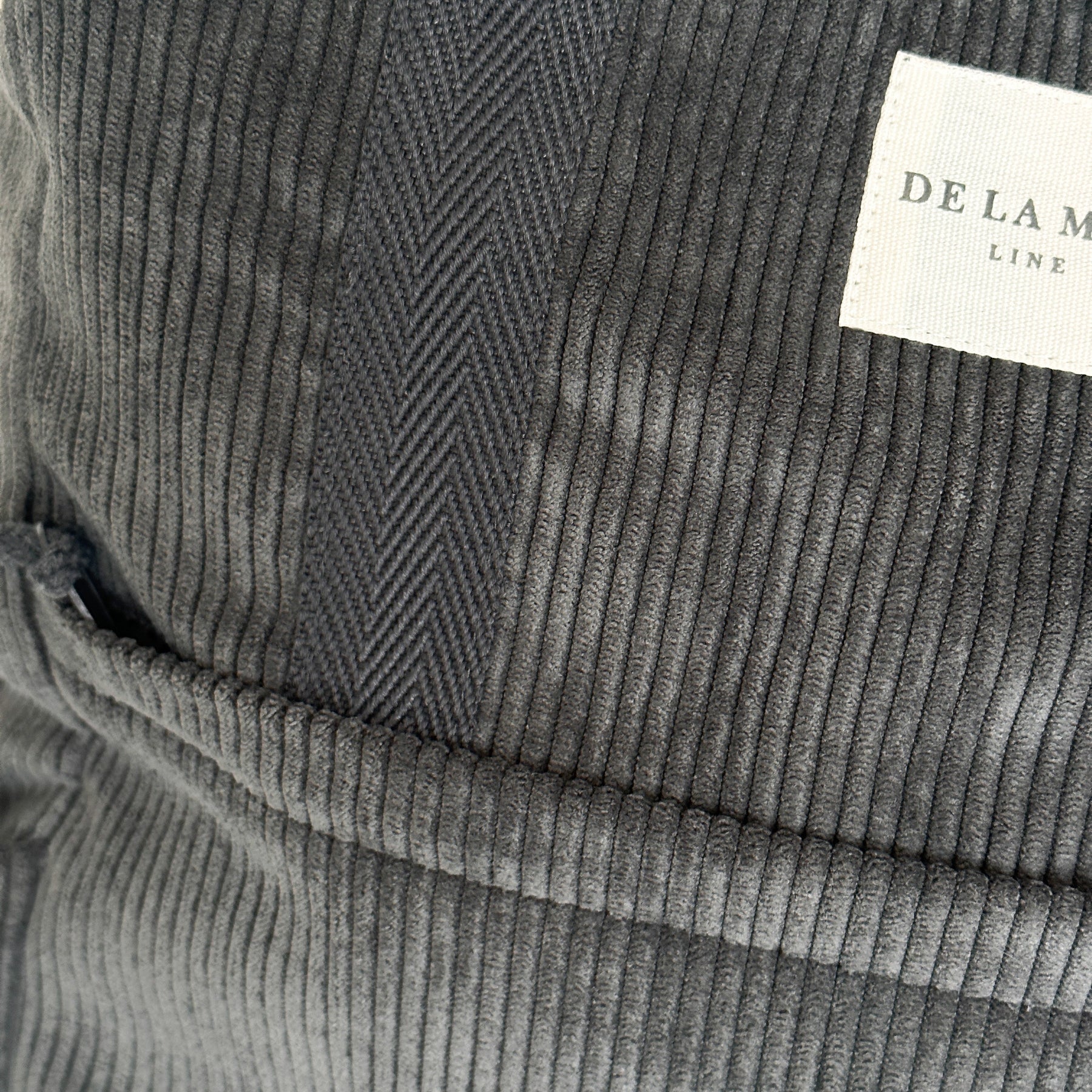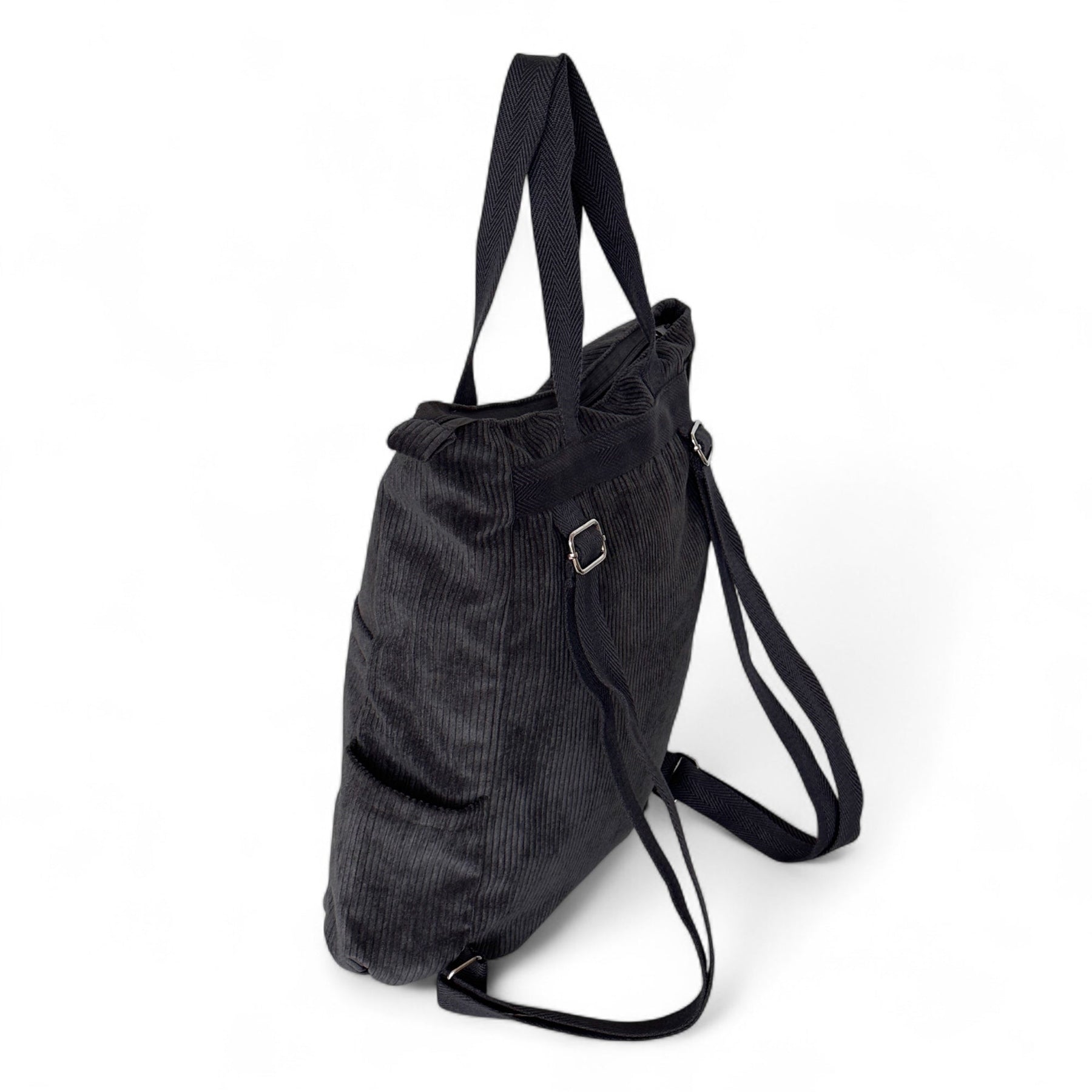 Convertible backpack and shoulder bag with adjustable straps and two top handles to carry it over the shoulder. Made from thick dark grey corduroy upholstery fabric. Interior zip pocket. Dark grey cotton herringbone tape handles. For proper care, wash in cold water and do not tumble dry.