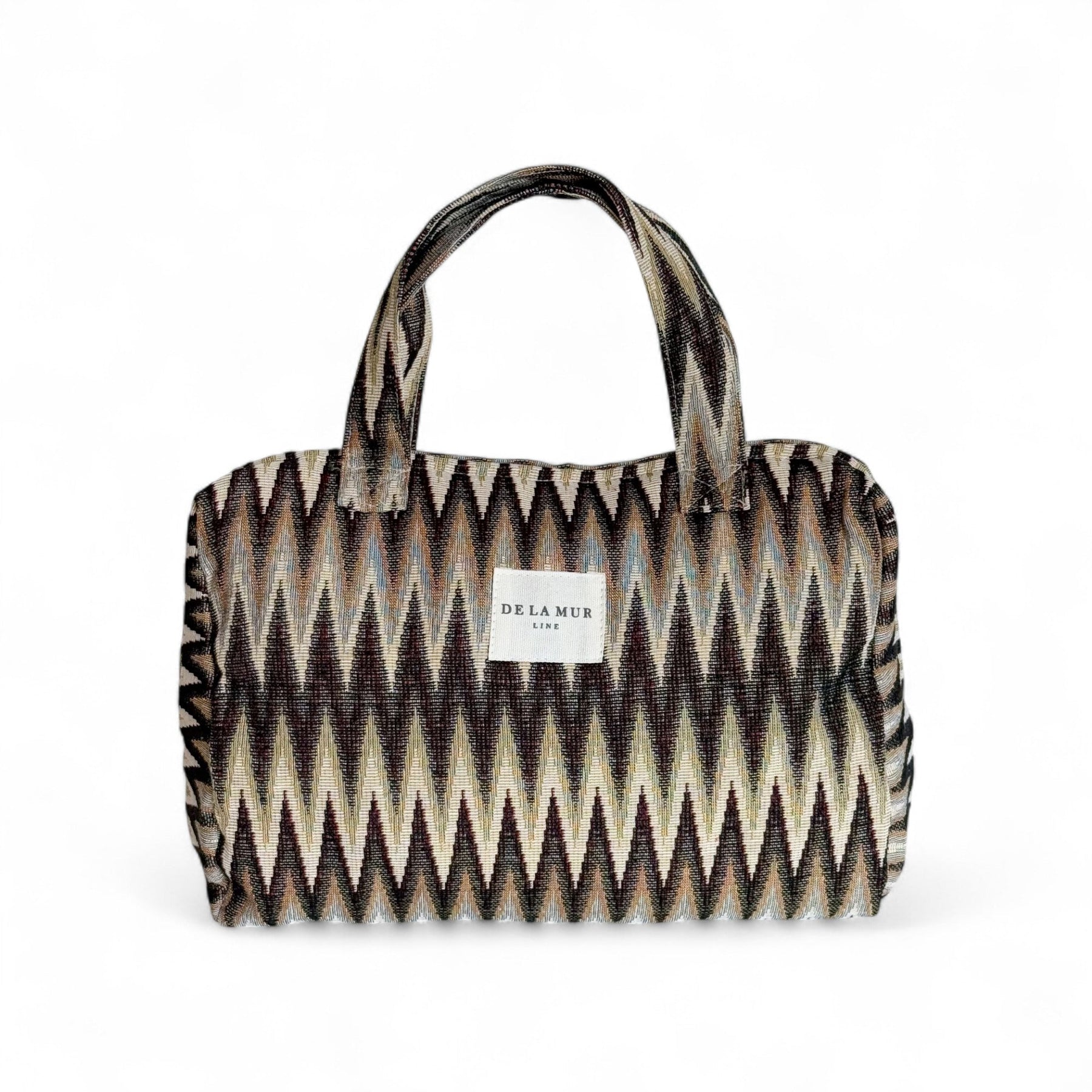 Neceser extra grande con cremallera en la parte superior y asas de tela en la parte superior. Con tejido grueso de jacquard con estampado tipo zigzag de color negro, beige y marrón. Forrado de tejido grueso de color gris en la parte interior. Para su correcto mantenimiento se aconseja lavarlo en frío a mano y no utilizar secadora.