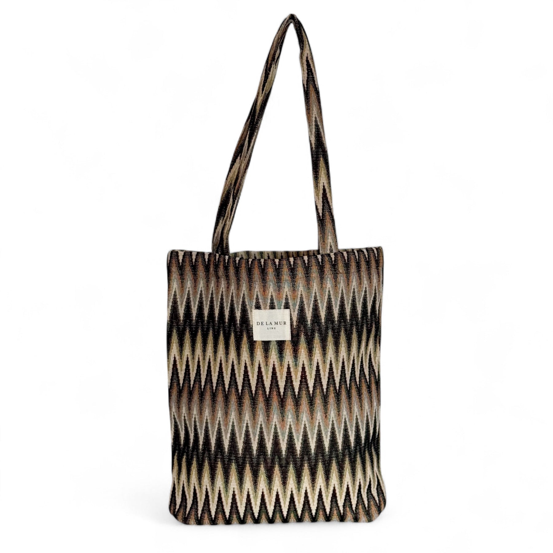 Bolsa "tote bag" con asas para llevar al hombro. Con tejido grueso de jacquard con estampado geométrico tipo zigzag en tonos marrones y beige. Para su correcto mantenimiento se aconseja lavarlo en frío y no utilizar secadora.