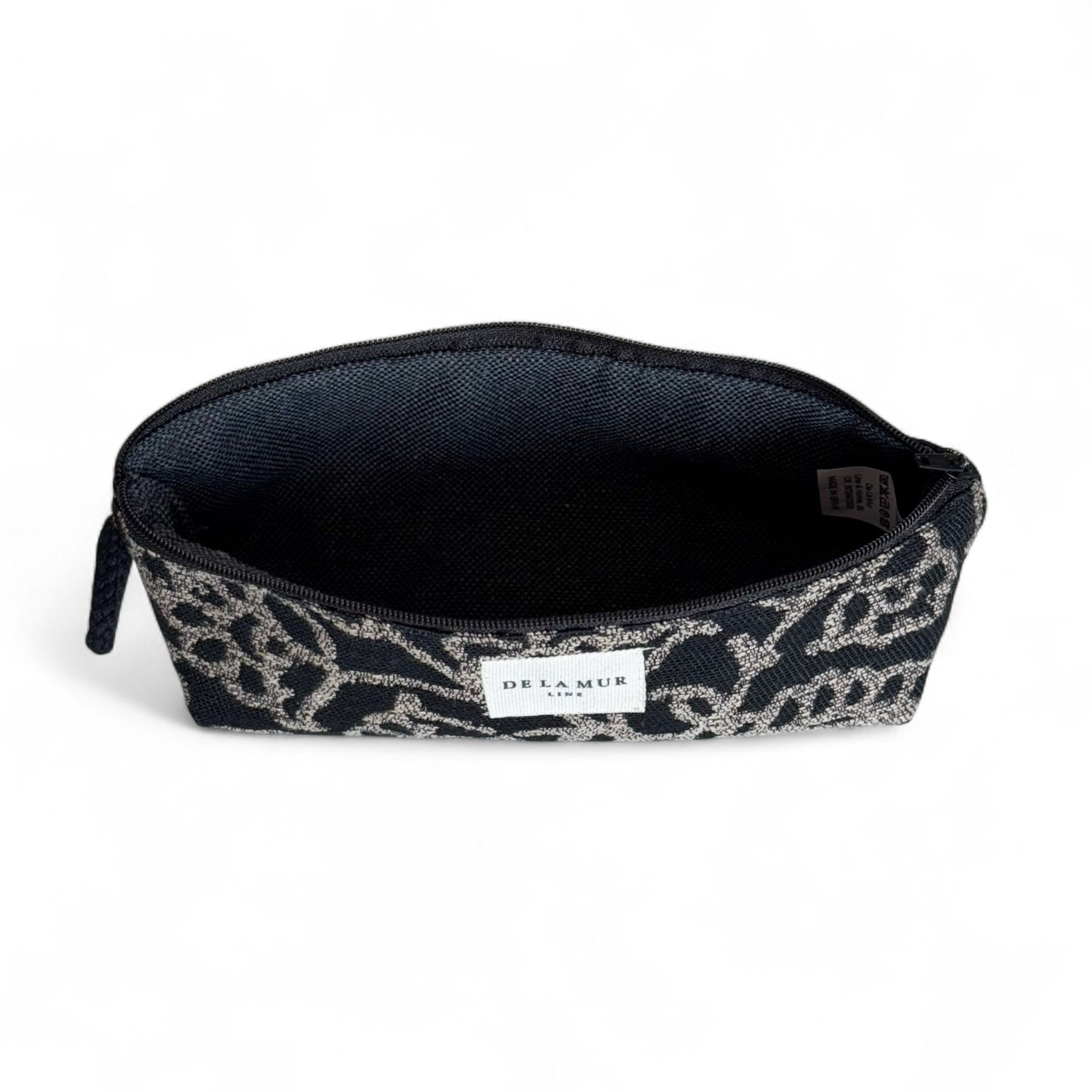Estuche con cremallera en la parte superior. Con tejido grueso de jacquard con estampado floral de color beige sobre fondo negro. Cada articulo puede tener una variación en el estampado, dependiendo de donde se haya efectuado el corte de la pieza. Forrado de tejido grueso de color gris en la parte interior. Para su correcto mantenimiento se aconseja lavarlo en frío a mano y no utilizar secadora.