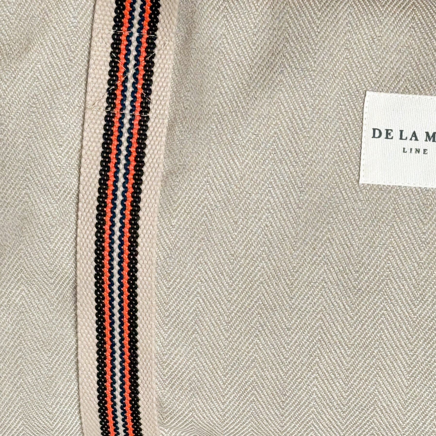 Sac de sport avec anses supérieures de taille moyenne, en toile de coton beige avec une bande centrale marron et orange. Confectionné en tissu beige uni épais à chevrons, il possède une fermeture éclair grise sur le dessus et une poche intérieure zippée. Doublé en tissu gris épais. Pour un entretien optimal, nous recommandons un lavage à la main à l'eau froide et l'utilisation d'un sèche-linge.