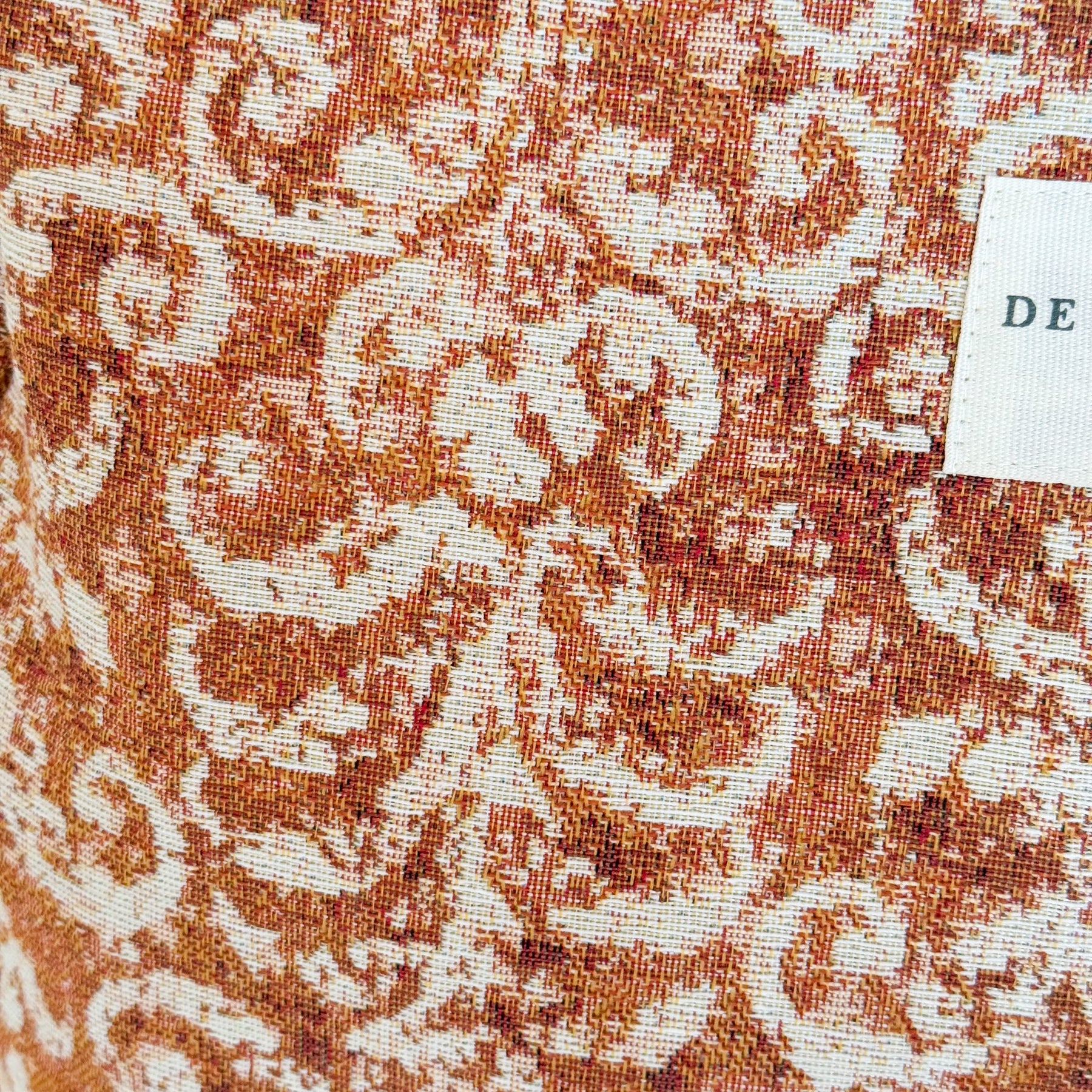 Sac de taille moyenne avec fermeture éclair sur le dessus et bandoulières. Poches latérales. Confectionné en tissu jacquard épais à imprimé géométrique terracotta. Pour un entretien optimal, nous recommandons le lavage à la main à l'eau froide et l'utilisation d'un sèche-linge.