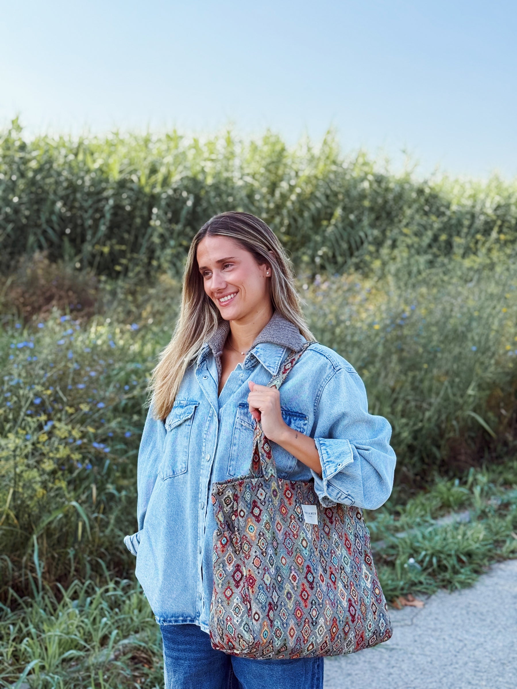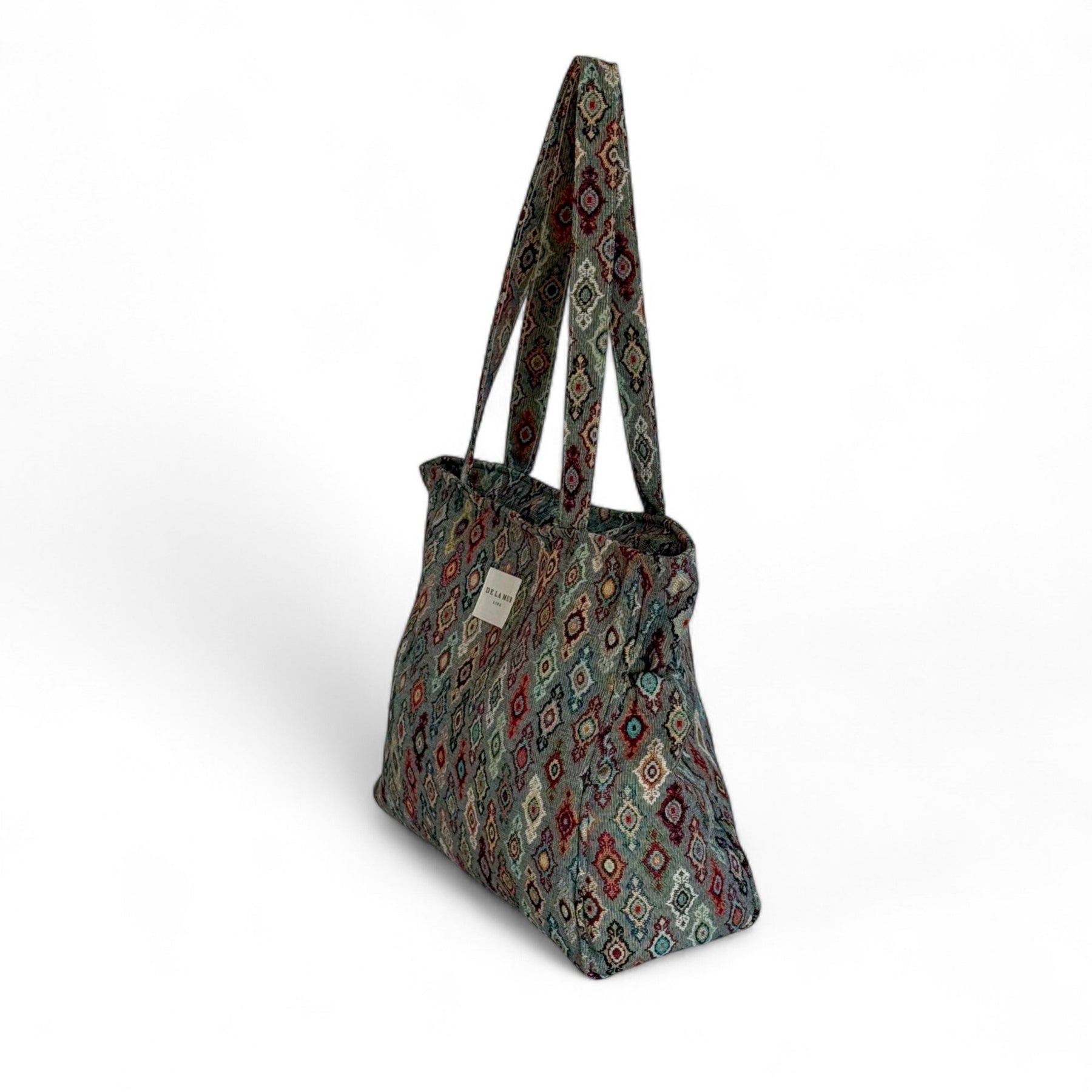 Sac de taille moyenne avec fermeture éclair sur le dessus et bandoulières. Poches latérales. Confectionné en tissu jacquard épais à imprimé géométrique multicolore sur fond gris. Pour un entretien optimal, nous recommandons le lavage à la main à l'eau froide et l'utilisation d'un sèche-linge.