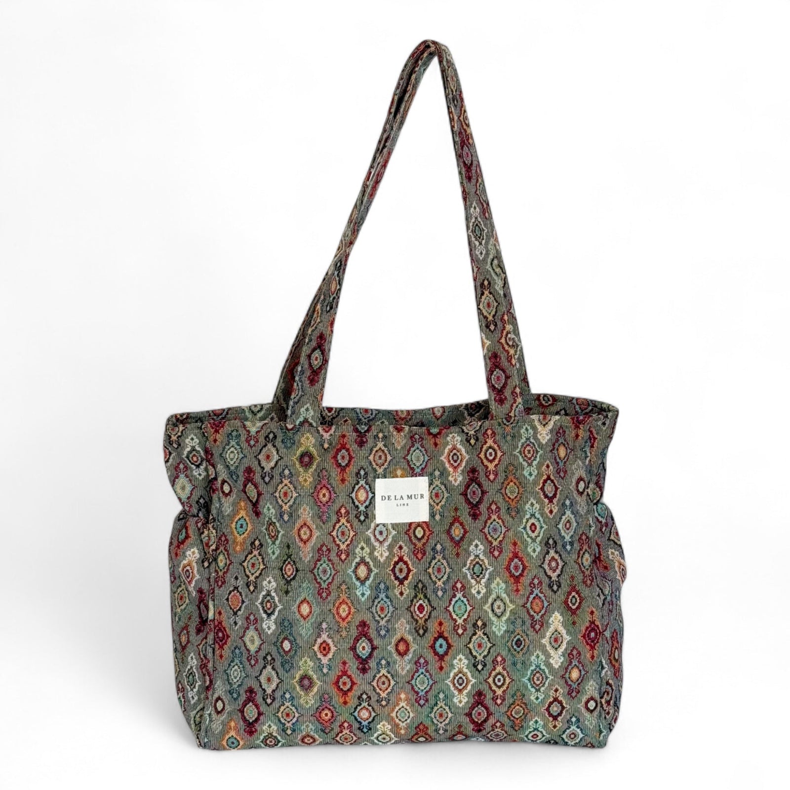 Sac de taille moyenne avec fermeture éclair sur le dessus et bandoulières. Poches latérales. Confectionné en tissu jacquard épais à imprimé géométrique multicolore sur fond gris. Pour un entretien optimal, nous recommandons le lavage à la main à l'eau froide et l'utilisation d'un sèche-linge.