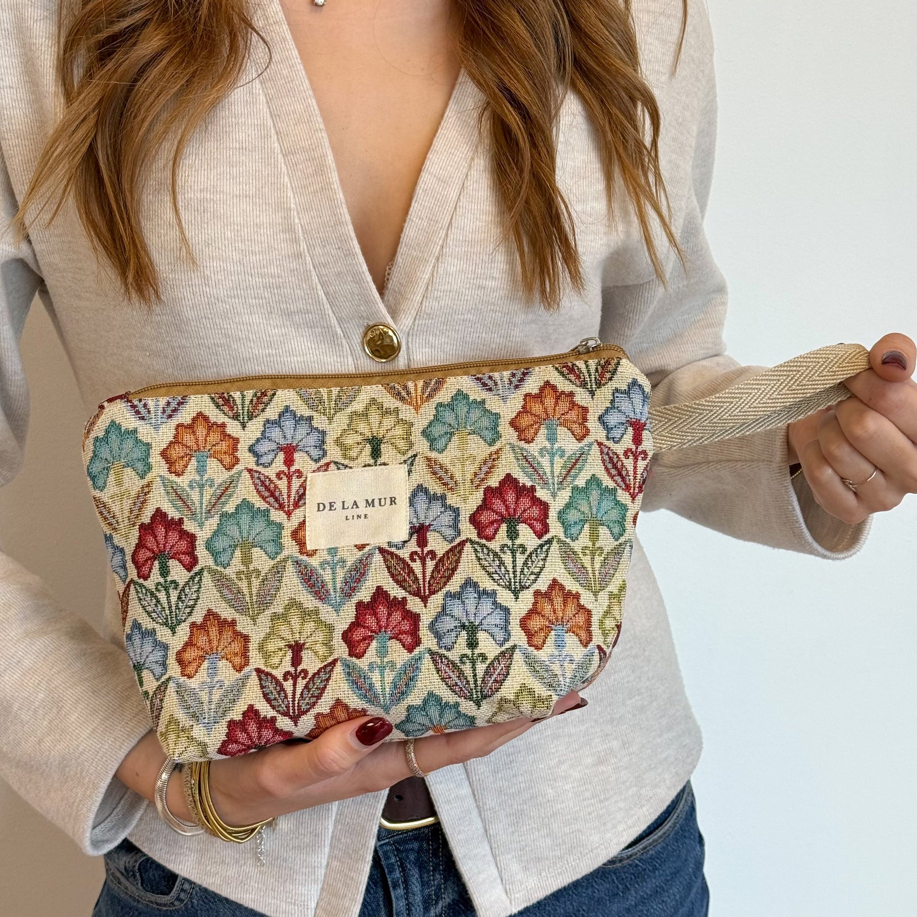 Large pouch with a zipper on top and a toasted beige cord handle on the side. Made of thick jacquard fabric, 80% cotton and 20% polyester, with a multicolor floral pattern. Lined with thick gray fabric on the inside. For proper care, hand wash in cold water and do not tumble dry.