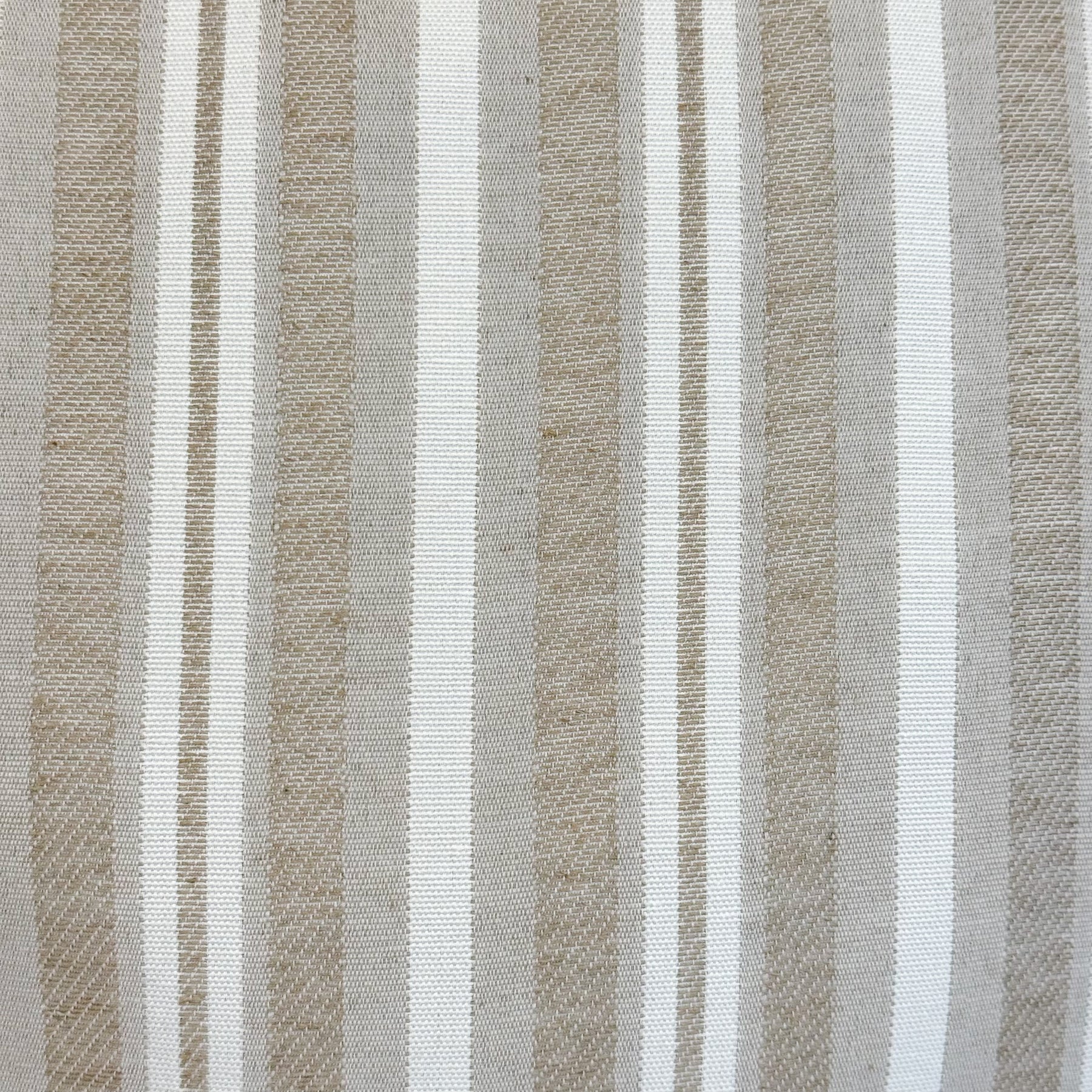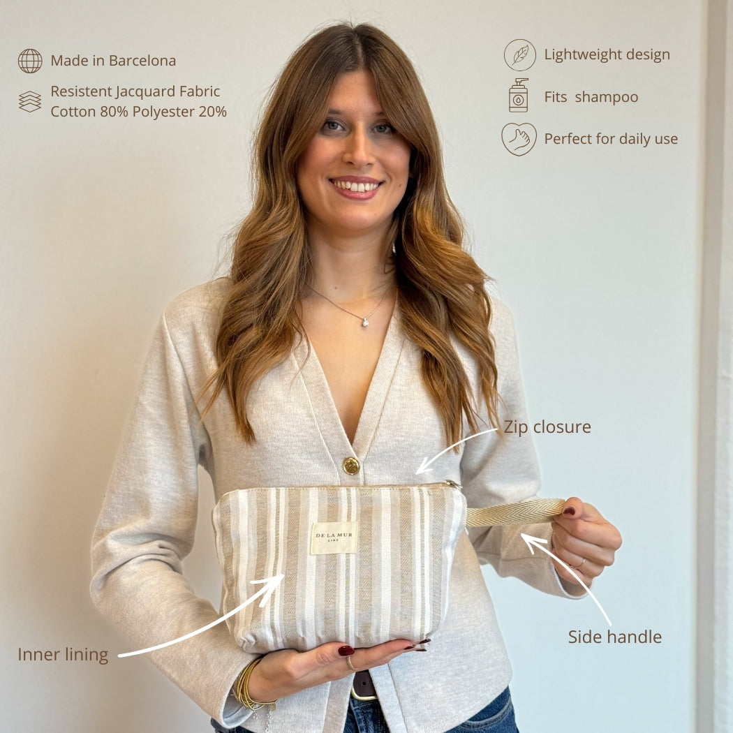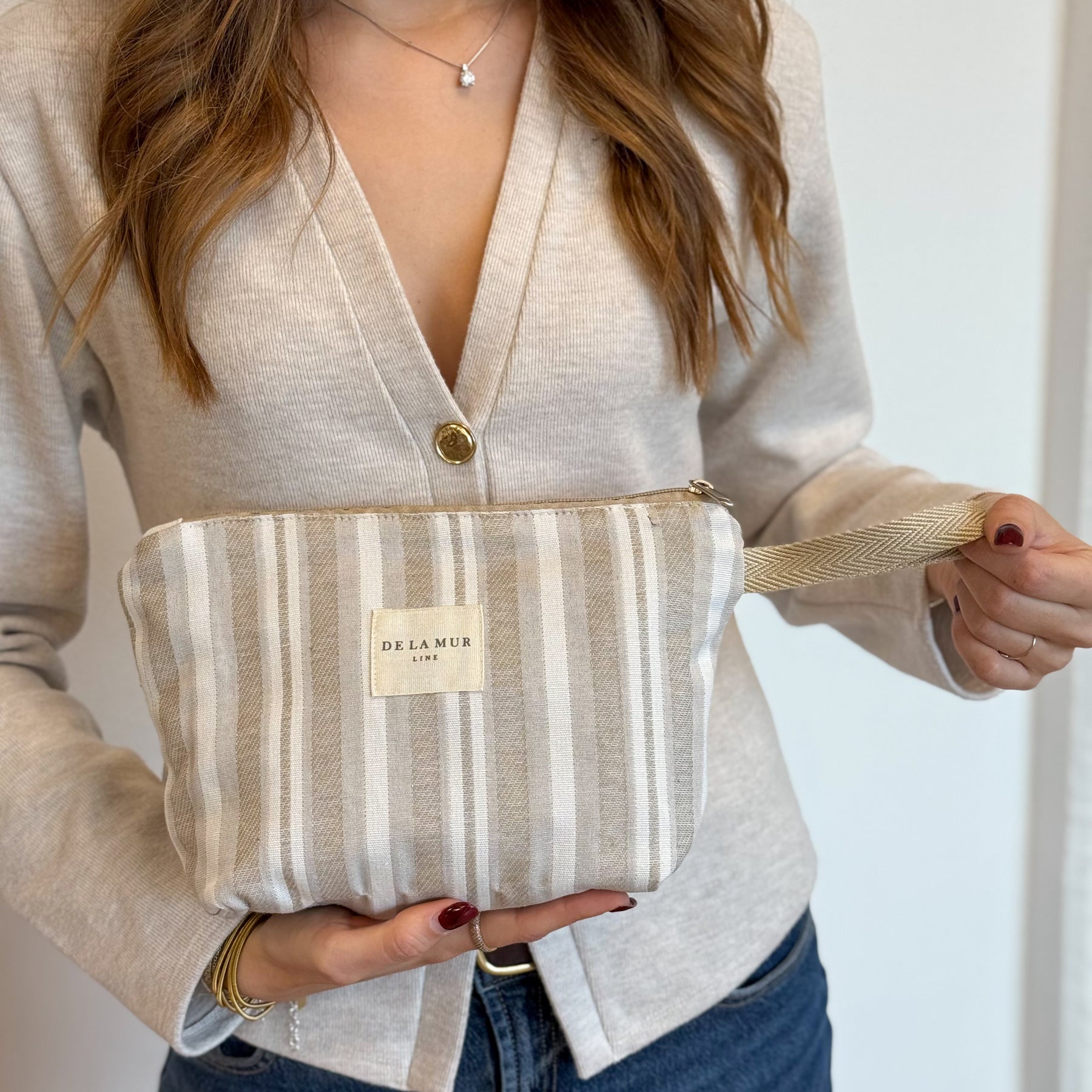 Large pouch with a zipper on top and a beige cord handle on the side. Made of thick jacquard fabric, 80% cotton and 20% polyester, with stripes in beige and off-white. Lined with thick gray fabric on the inside. For proper care, hand wash in cold water and do not tumble dry.
