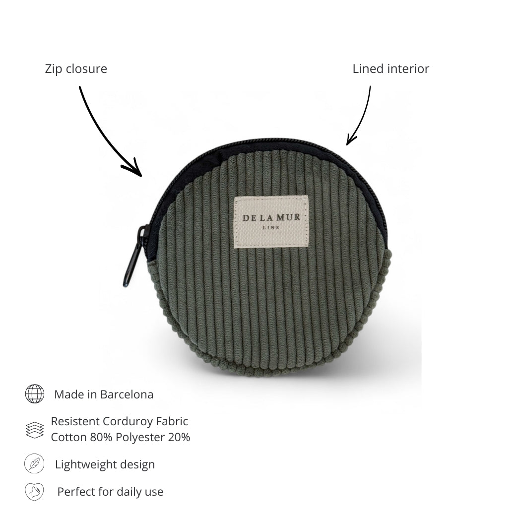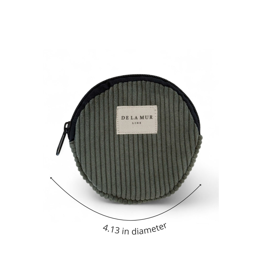 Sac à main rond avec fermeture éclair sur le dessus et petite anse en cordon noir sur le côté. Fabriqué en velours côtelé vert épais. L'imprimé peut varier selon la coupe. Doublé d'un épais tissu gris à l'intérieur. Pour un entretien optimal, nous recommandons un lavage à la main à l'eau froide et l'utilisation d'un sèche-linge.