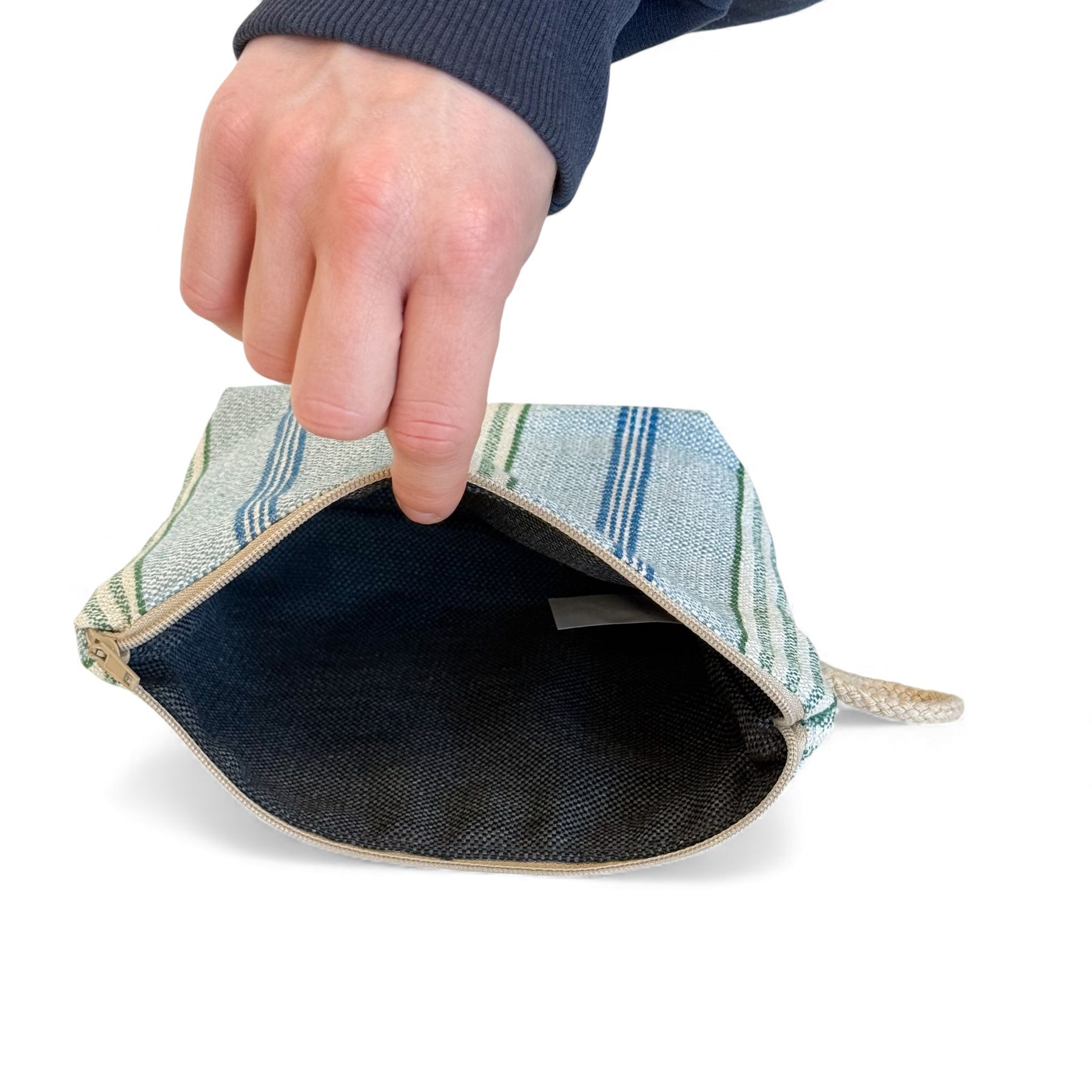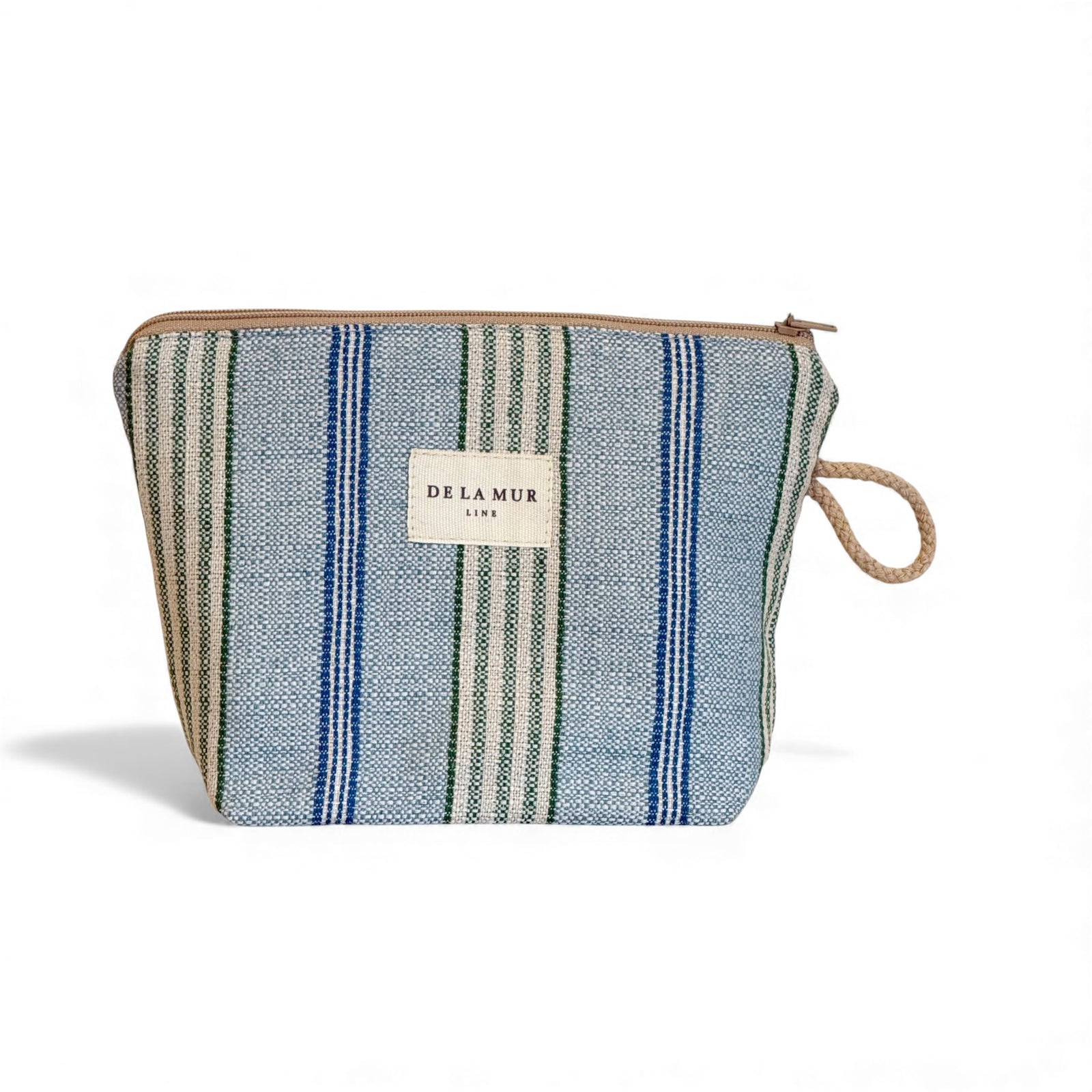 Small pouch with a zipper on top and a side handle made of beige cord. Made of thick jacquard fabric, 80% cotton and 20% polyester, with stripes in shades of blue and green. Each item may have slight variations in the pattern, depending on where the fabric was cut. For proper care, hand wash in cold water and do not tumble dry.