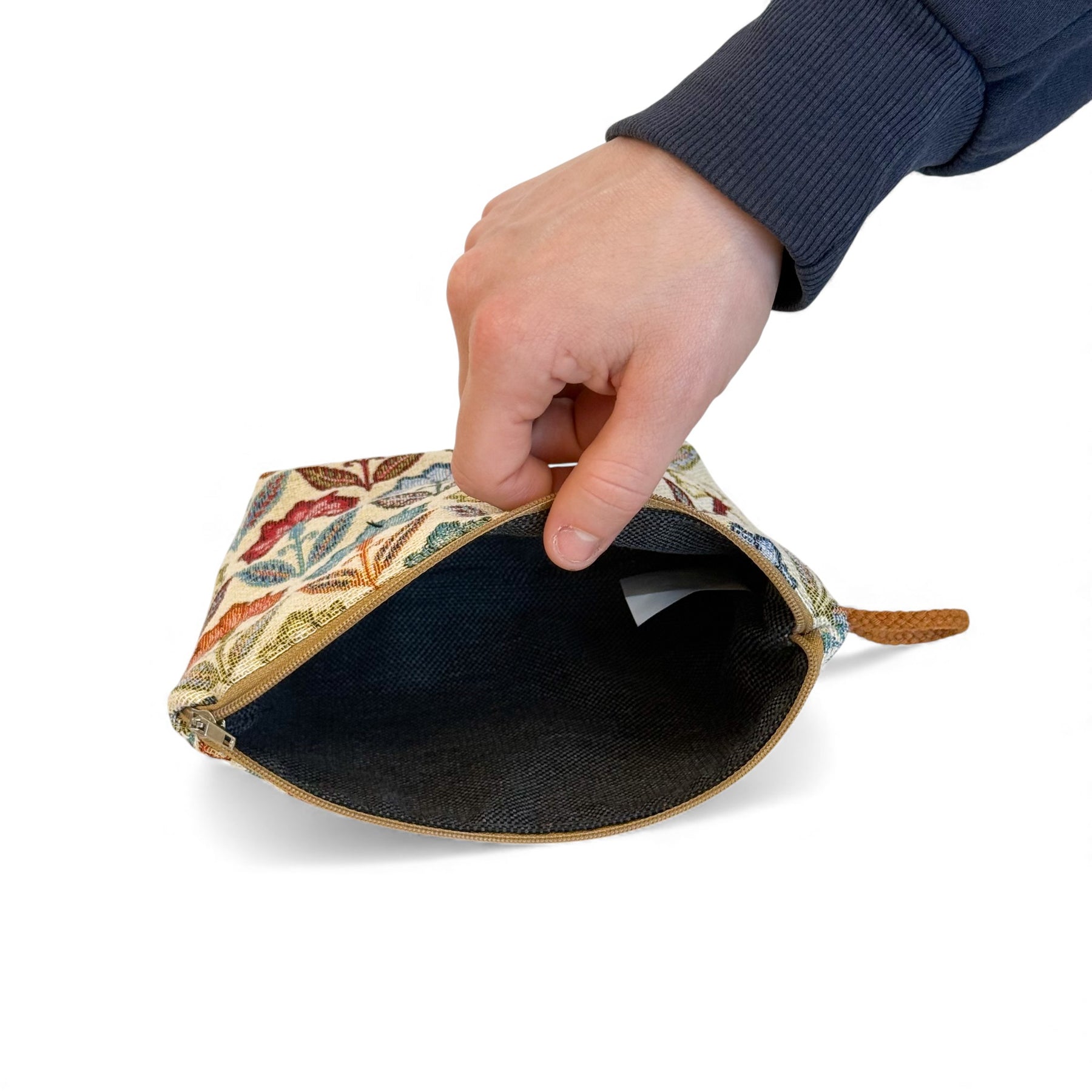 Small pouch with a zipper on top and a side handle made of toasted beige cord. Made of thick jacquard fabric, 80% cotton and 20% polyester, with a multicolor floral pattern. Each item may have slight variations in the pattern, depending on where the fabric was cut. For proper care, hand wash in cold water and do not tumble dry.