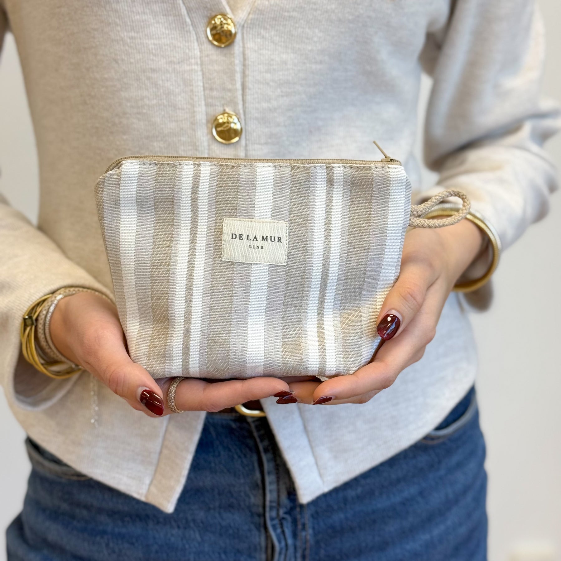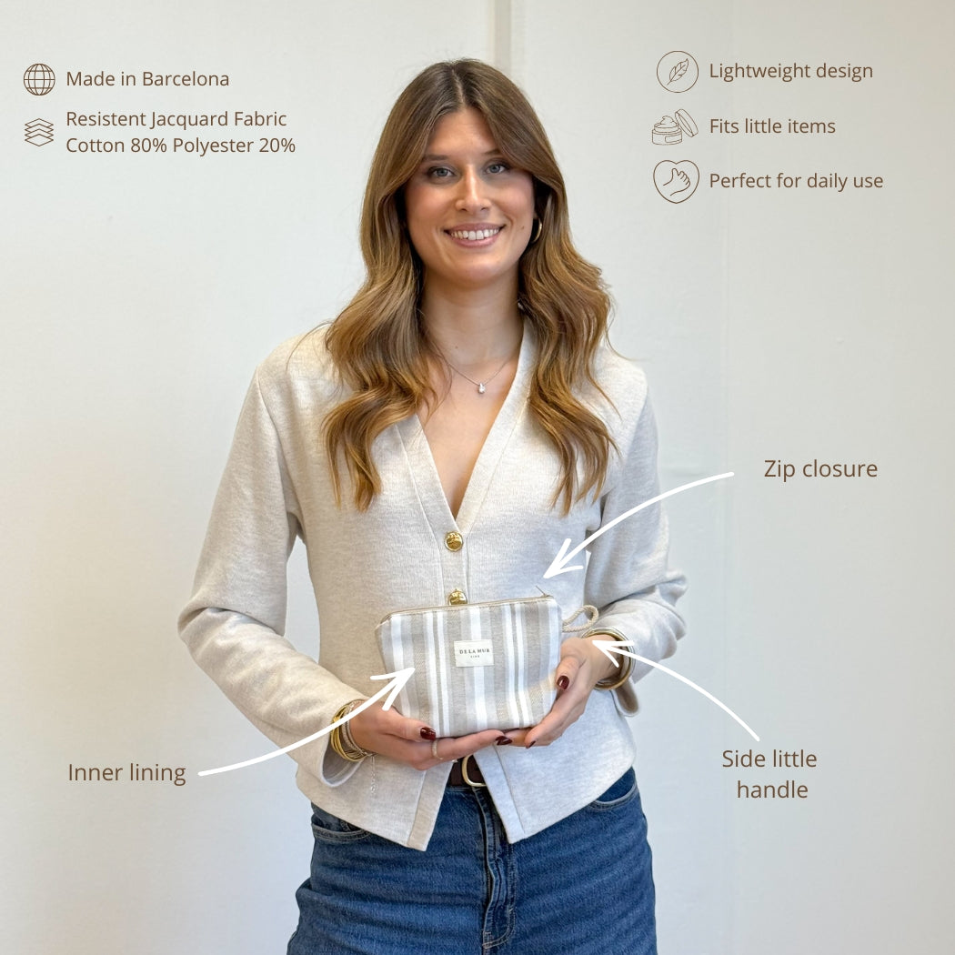 Small pouch with a zipper on top and a side handle made of beige cord. Made of thick jacquard fabric, 80% cotton and 20% polyester, with beige and off-white stripes. Each item may have slight variations in the pattern, depending on where the fabric was cut. For proper care, hand wash in cold water and do not tumble dry.