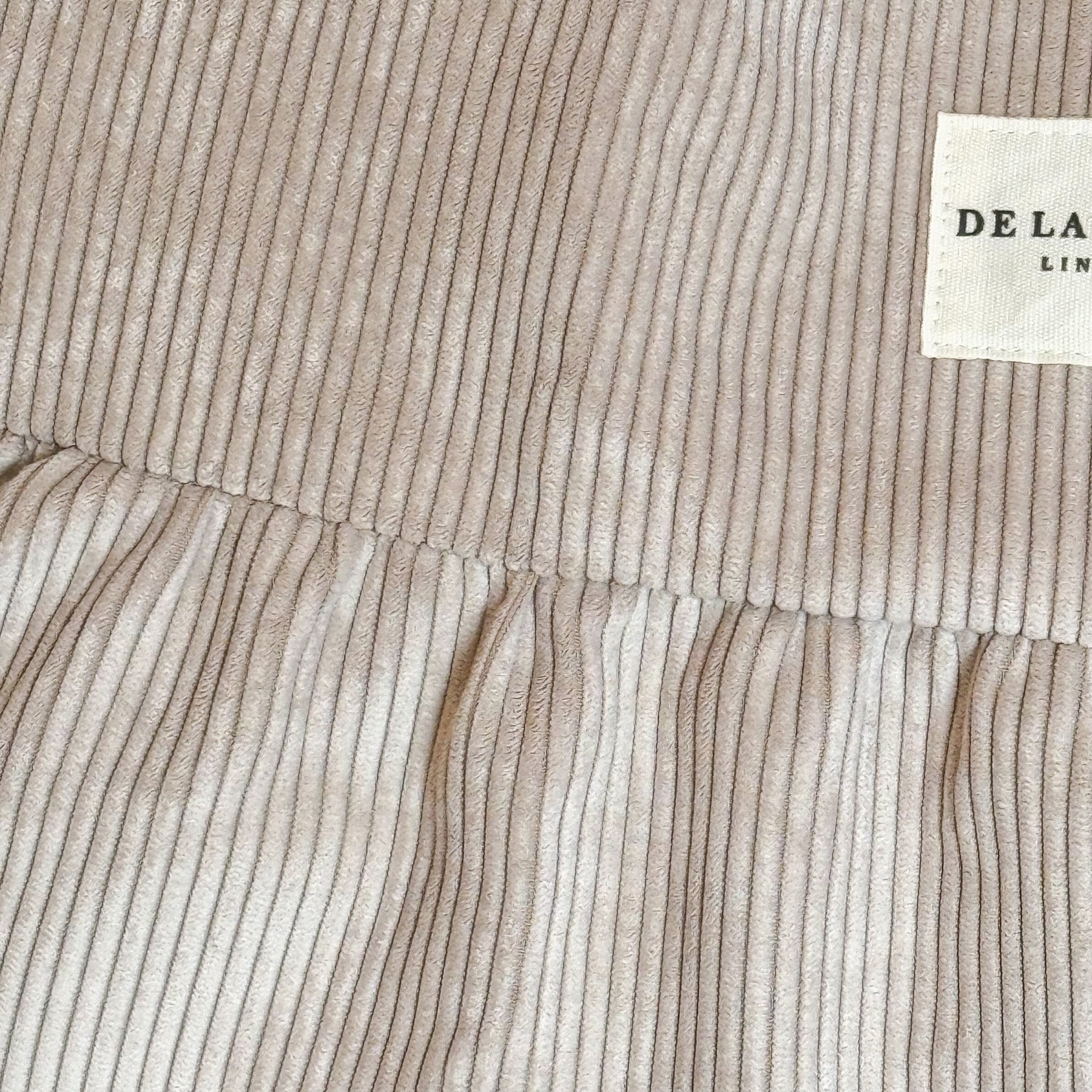 Made from thick beige corduroy fabric. For proper care, we recommend hand washing in cold water and avoiding the dryer.