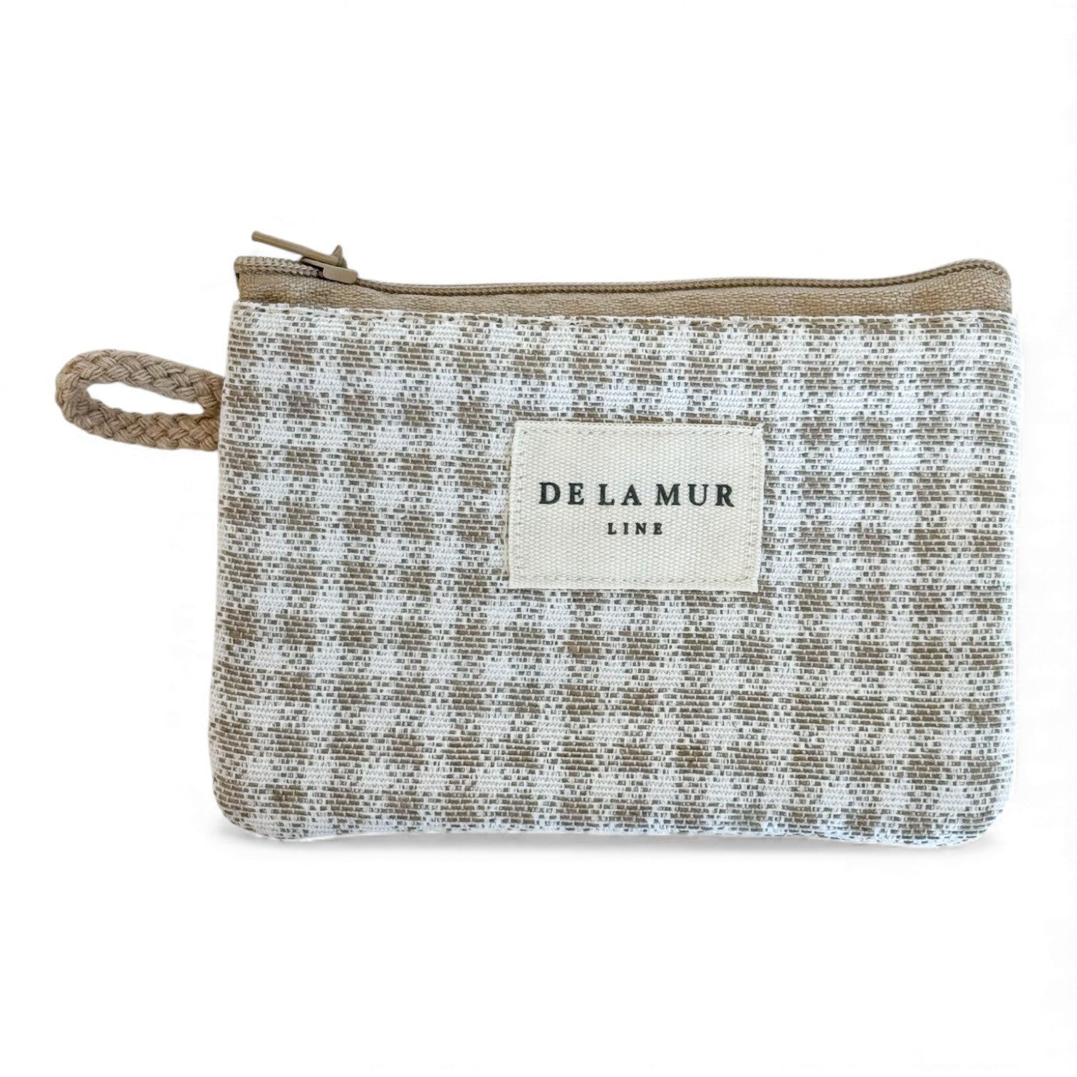 Coin purse with a top zipper and a small beige cord side handle. Made from thick jacquard fabric (80% cotton, 20% polyester) with a vichy check pattern in beige and ecru tones. Each item may vary slightly in pattern, depending on where the fabric is cut. Fully lined with thick gray fabric on the inside.