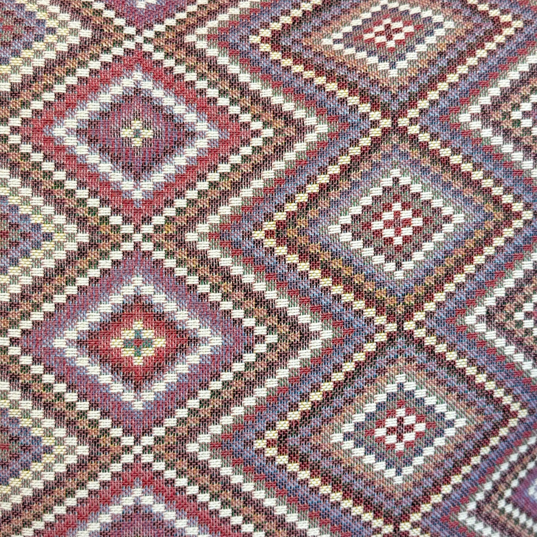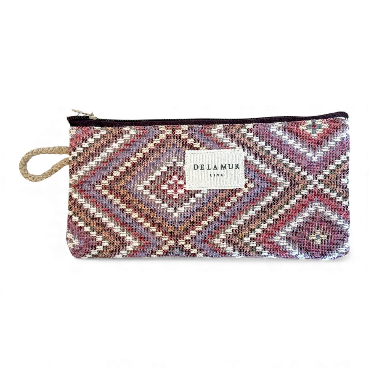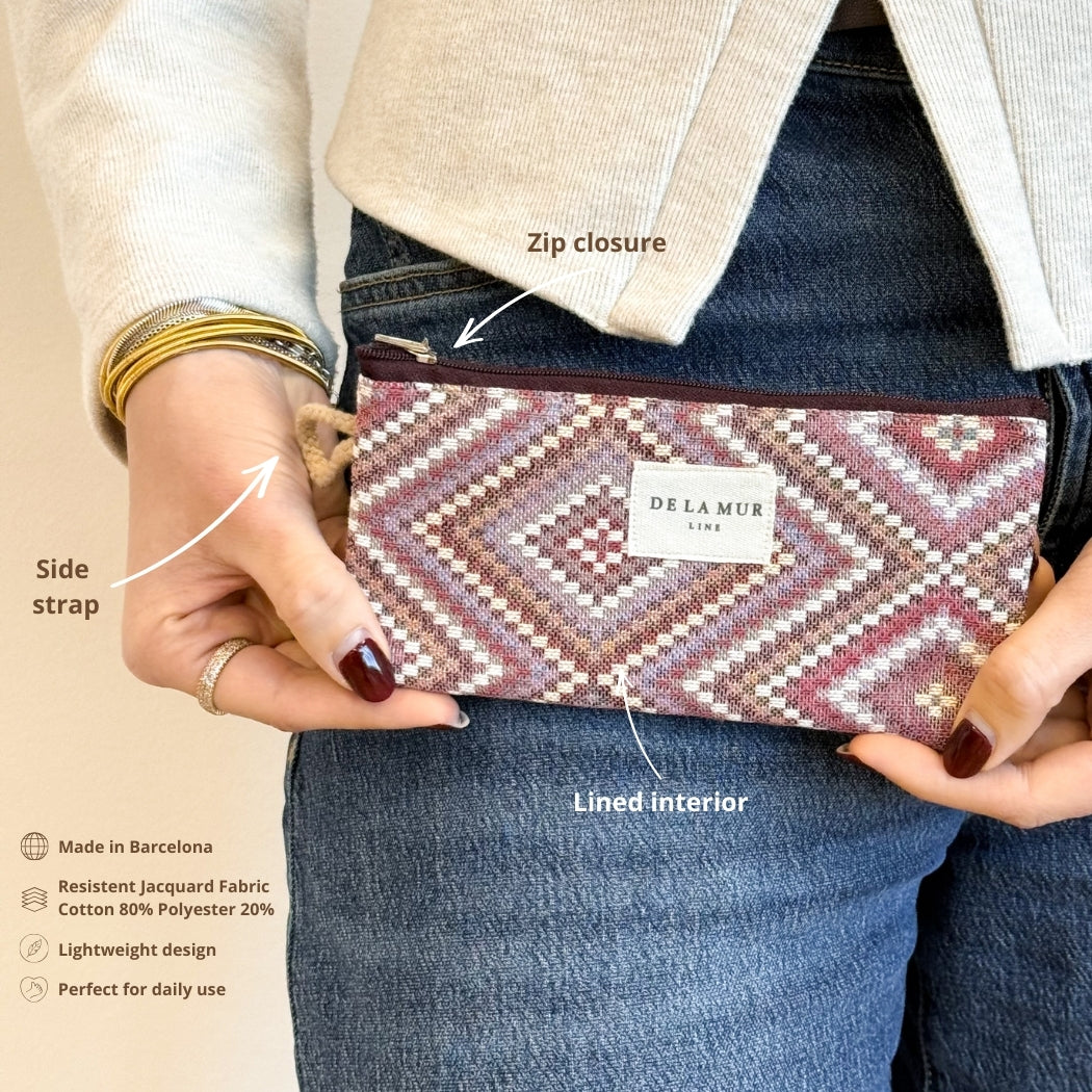 Eyewear case with a zipper on top and a small beige cord handle on the side. Made of thick jacquard fabric, 80% cotton and 20% polyester, with a geometric pattern in shades of pink and lilac. Each item may have slight variations in the pattern, depending on where the fabric was cut. Lined with thick gray fabric on the inside. For proper care, hand wash in cold water and do not tumble dry.