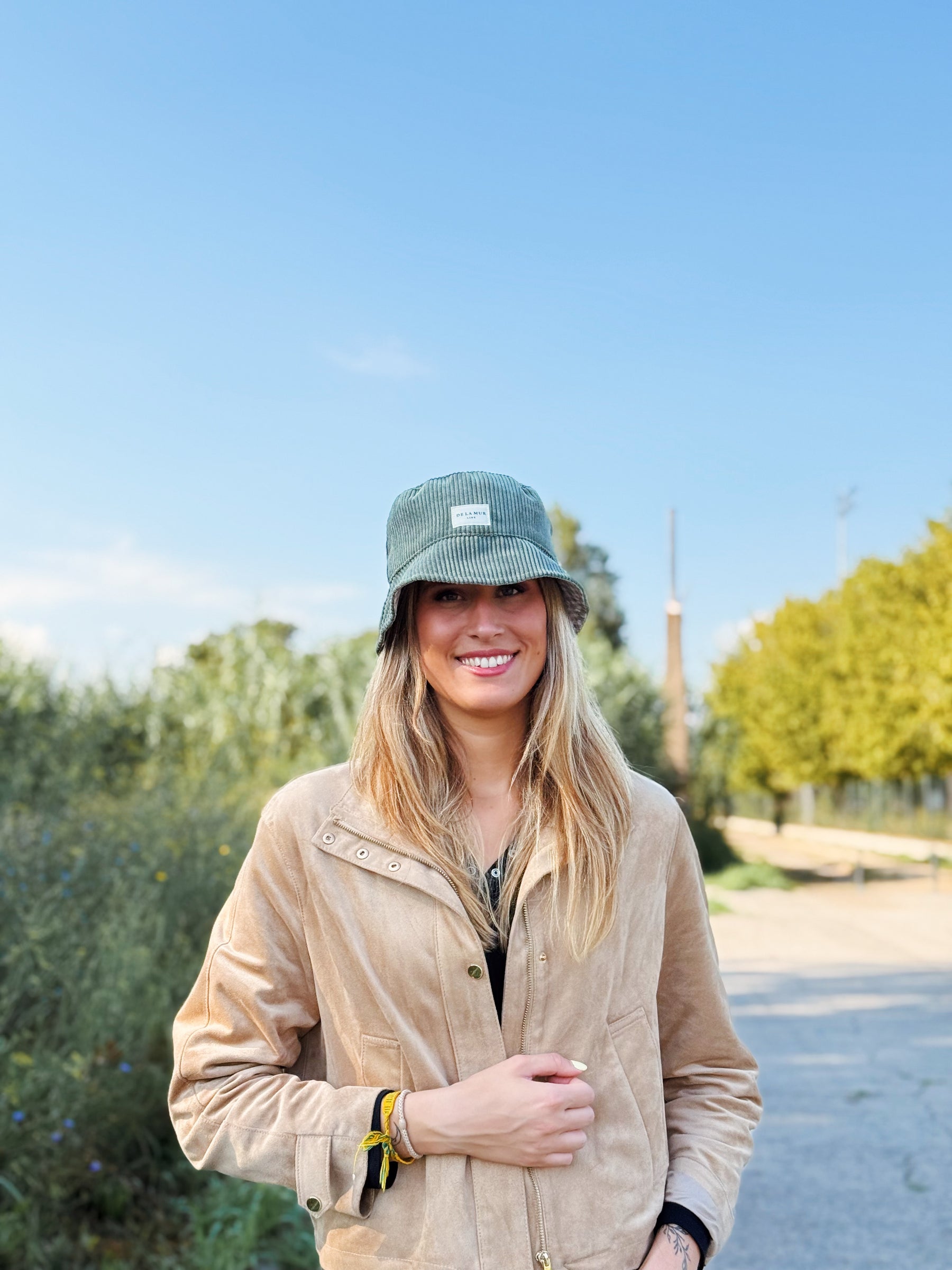 Bucket hat made of thick green corduroy fabric with a printed lining on the inside. Reversible. One size fits all. For proper care, wash in cold water and do not tumble dry.