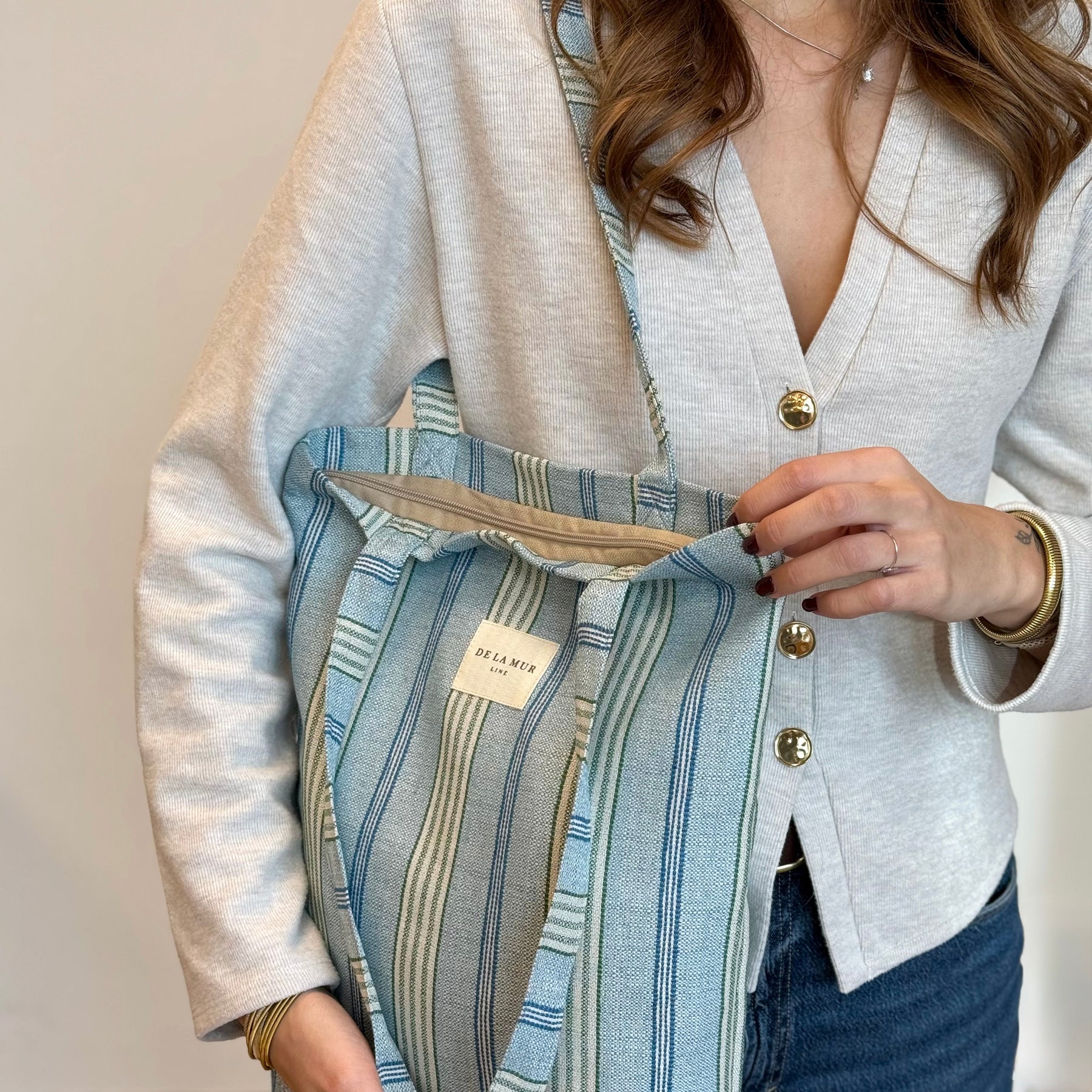 Medium zippered tote bag with shoulder straps. Made from thick jacquard fabric (80% cotton, 20% polyester) with a striped print in blue and green tones. Features a top zip closure. For proper care, we recommend washing in cold water and not using a tumble dryer.