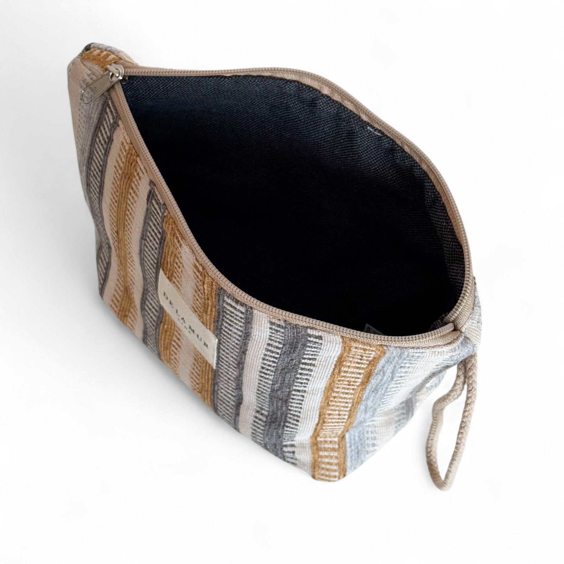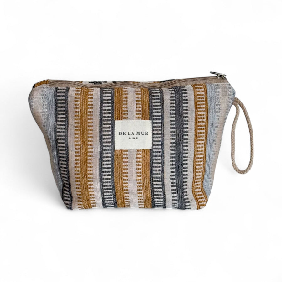 Large pouch with a zipper on top and a beige cord handle on the side. Made from thick jacquard fabric with a multicolor striped pattern. For proper care, wash in cold water and do not tumble dry.