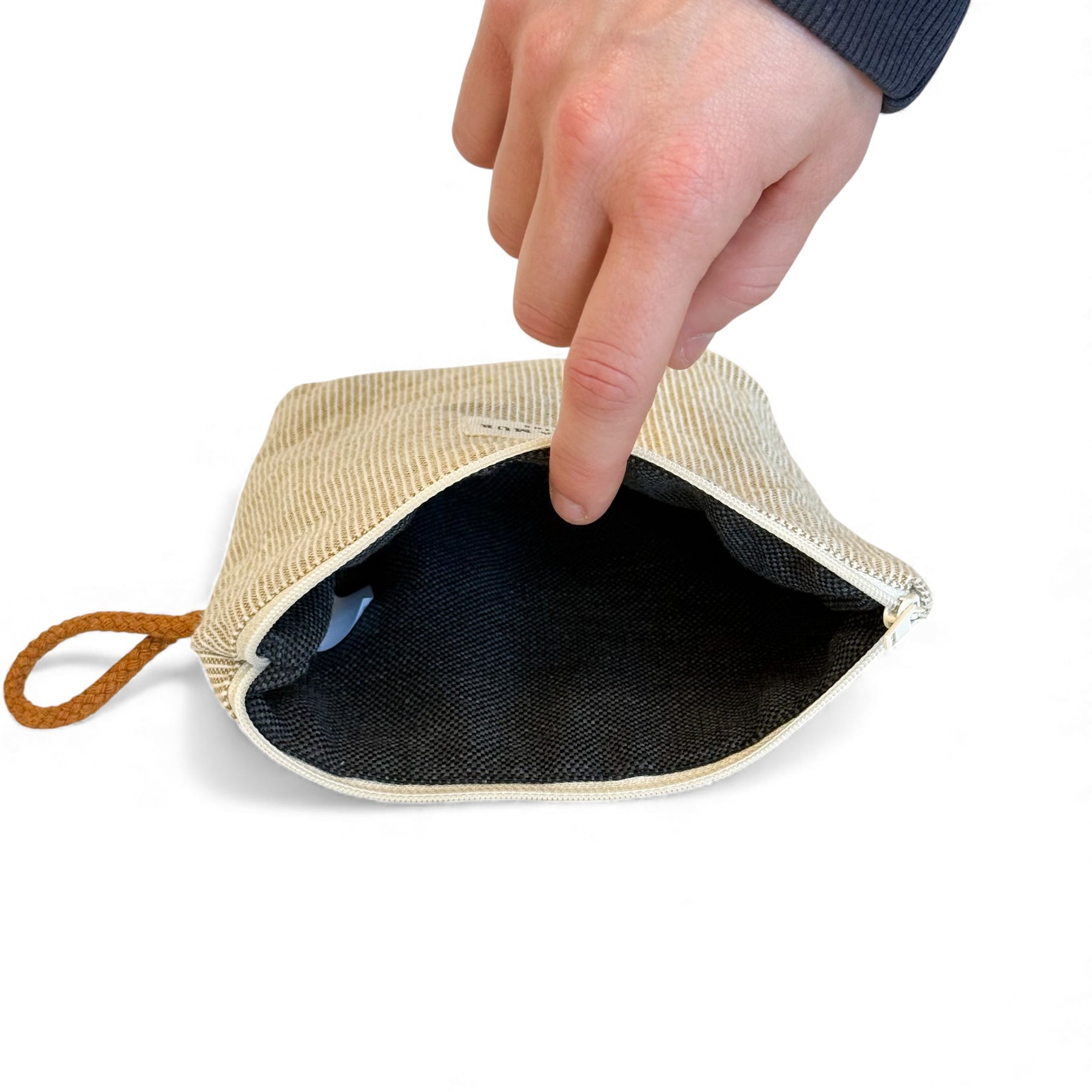 Small toiletry pouch with a top zipper and a rust-colored cord side handle. Made from lightweight textured fabric (80% cotton, 20% polyester) with a subtle mustard-yellow striped print. Each item may vary slightly in pattern, depending on where the fabric is cut.