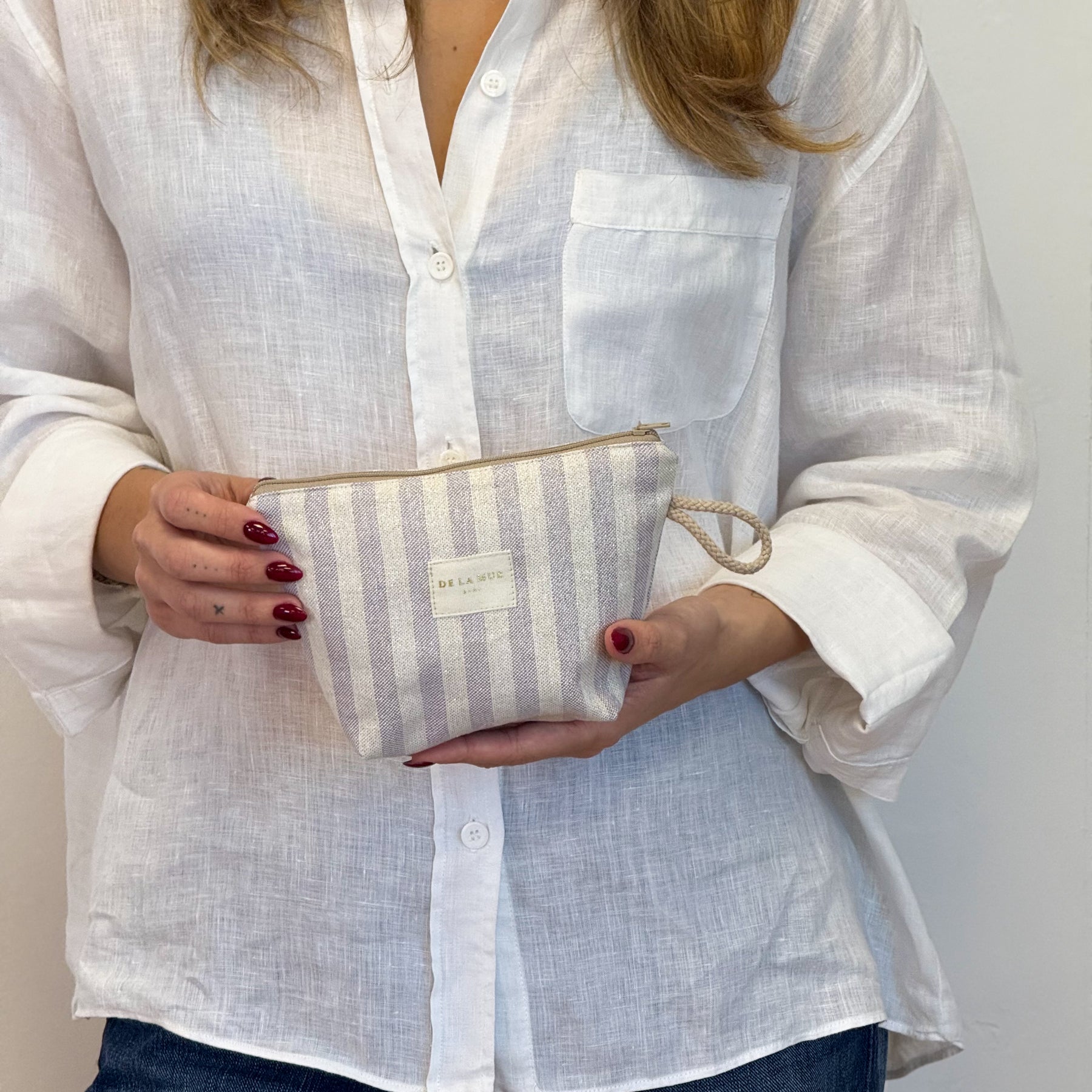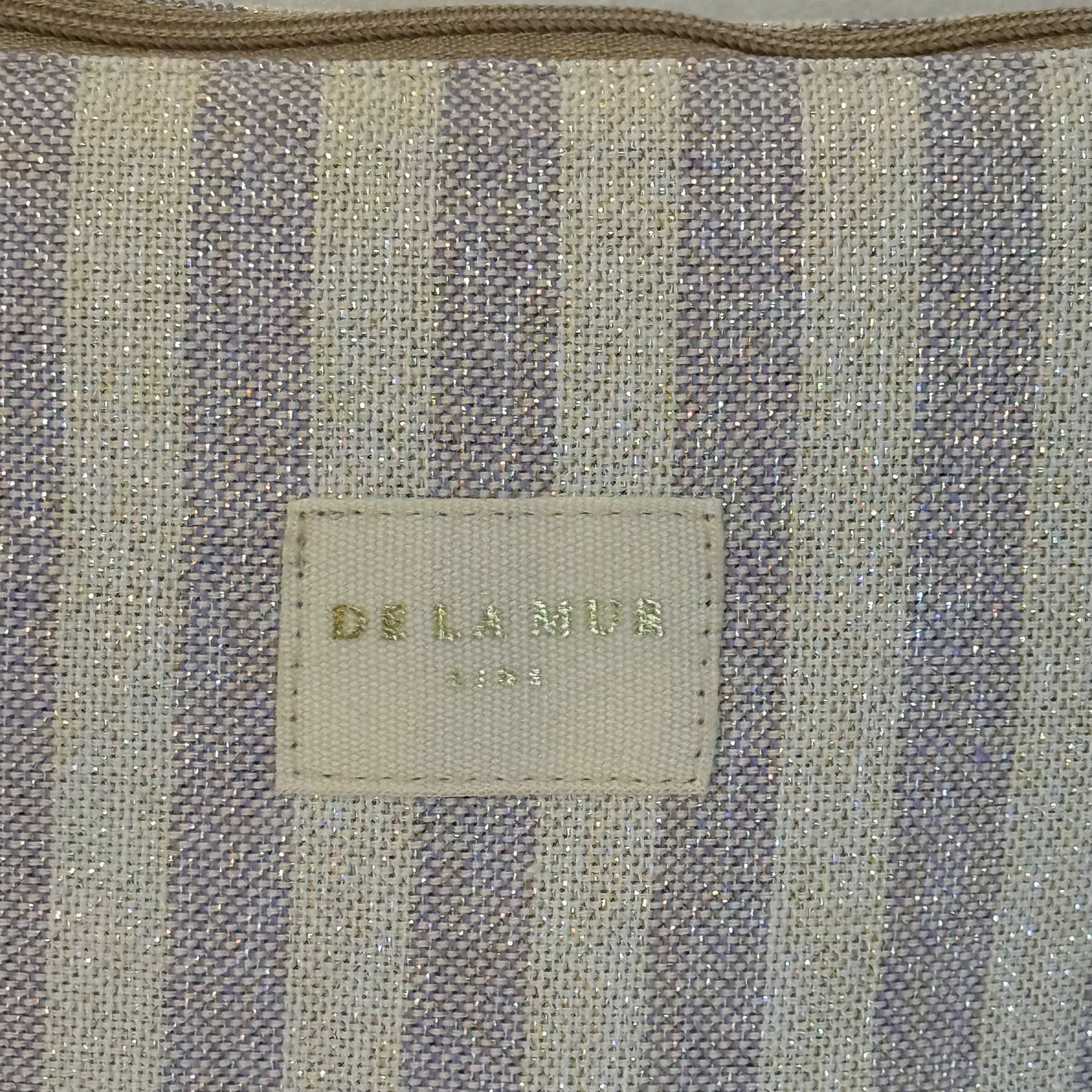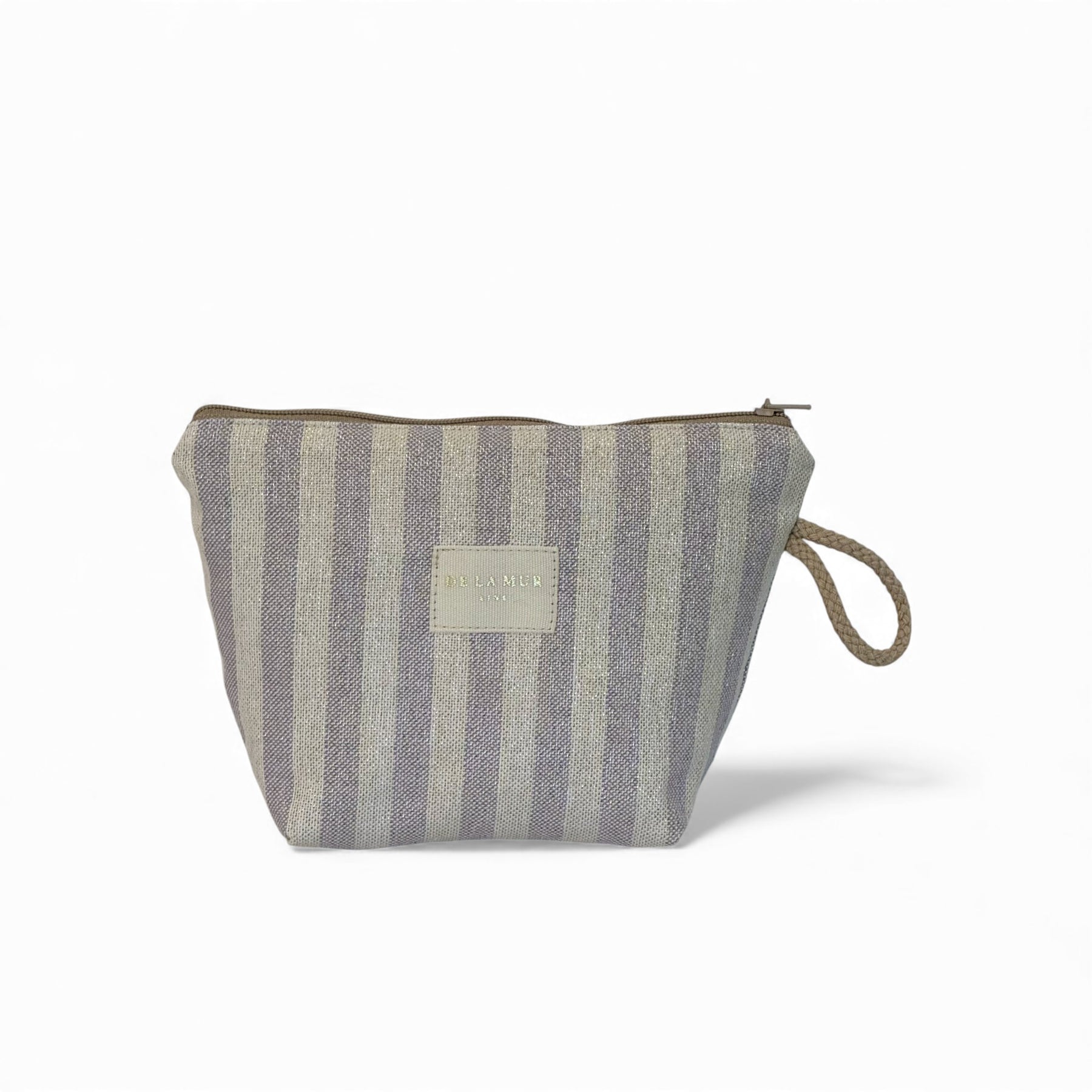 Small toiletry pouch with a top zipper and a beige cord side handle. Made from lightweight half-panama fabric (80% cotton, 20% polyester) with lilac stripes accented with Lurex. Features a brand label with gold Lurex. Each item may vary slightly in pattern, depending on where the fabric is cut. For proper care, it is recommended to wash in cold water and not tumble dry.