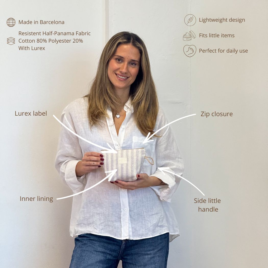 Small toiletry pouch with a top zipper—perfect for storing cosmetics, small essentials, or everyday items. Lightweight and versatile, with subtle Lurex accents that add a touch of sparkle.