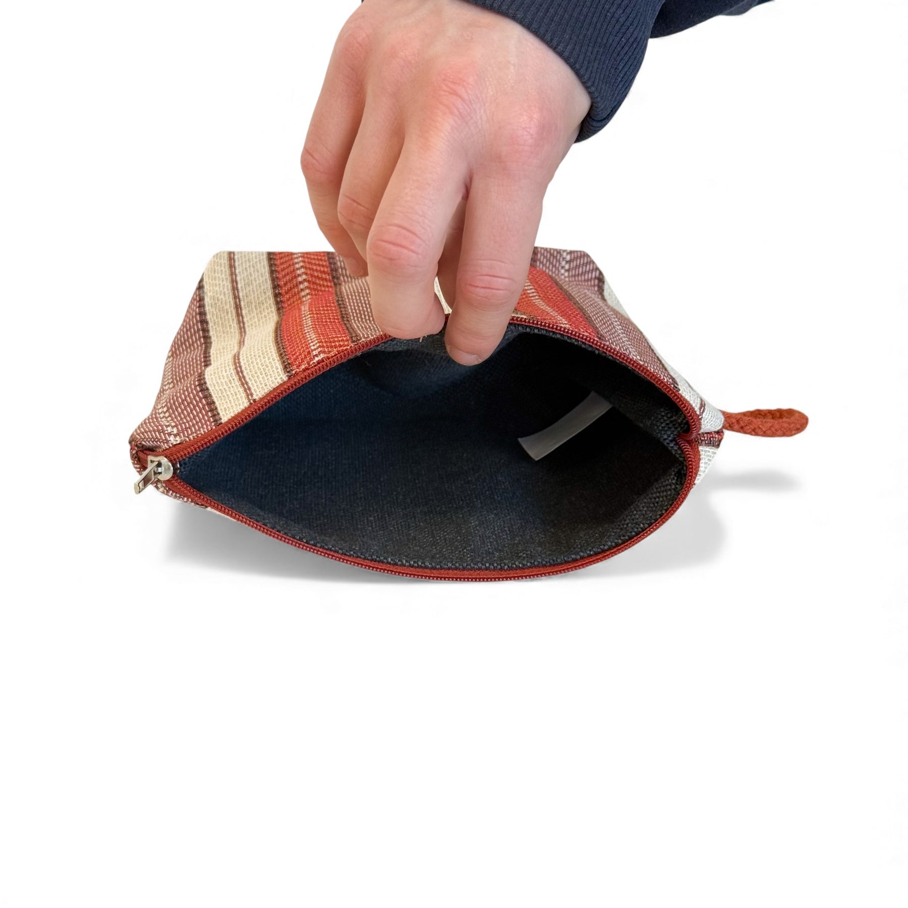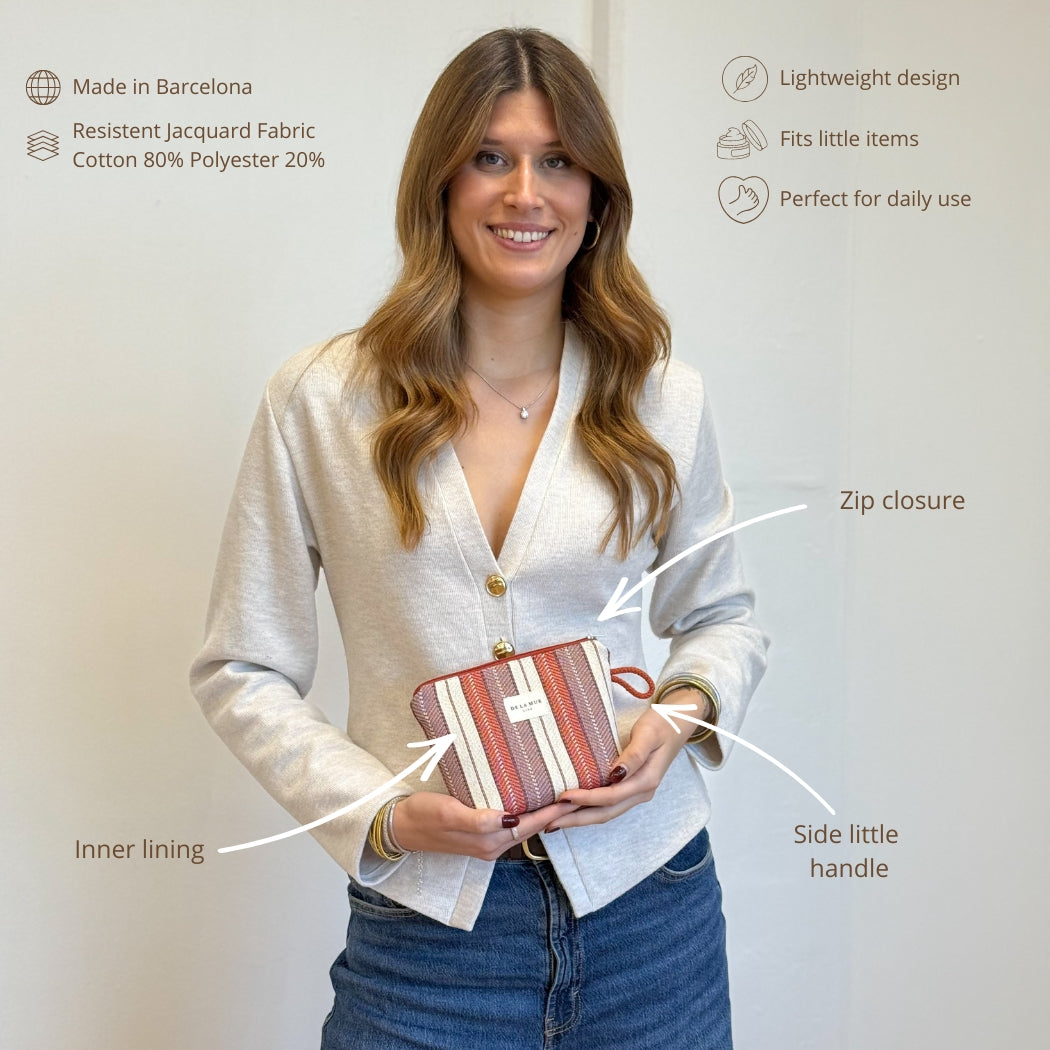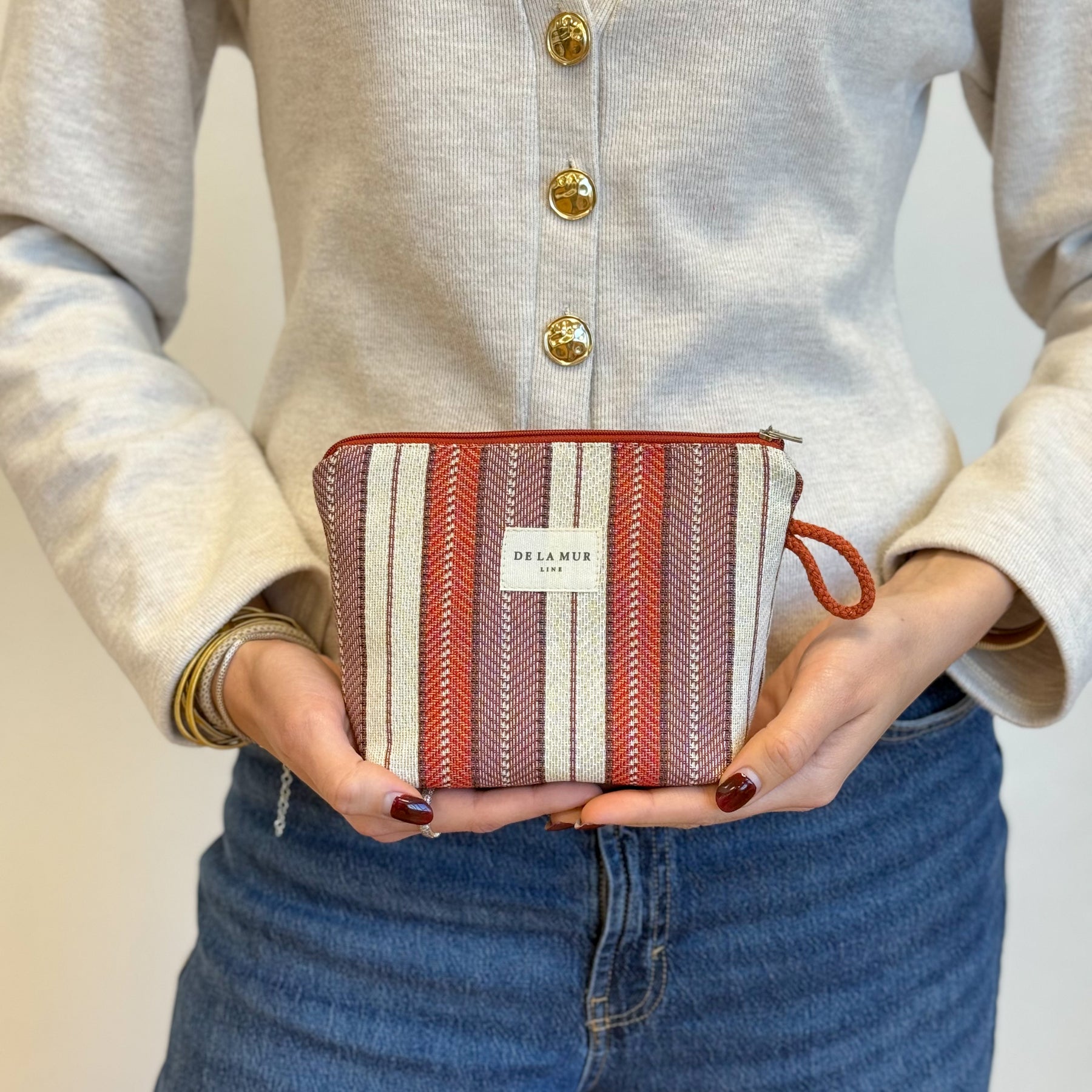 Small pouch with a zipper on top and a side handle made of burgundy cord. Made of thick jacquard fabric, 80% cotton and 20% polyester, with stripes in burgundy, lilac, and off-white. Each item may have slight variations in the pattern, depending on where the fabric was cut. For proper care, hand wash in cold water and do not tumble dry.