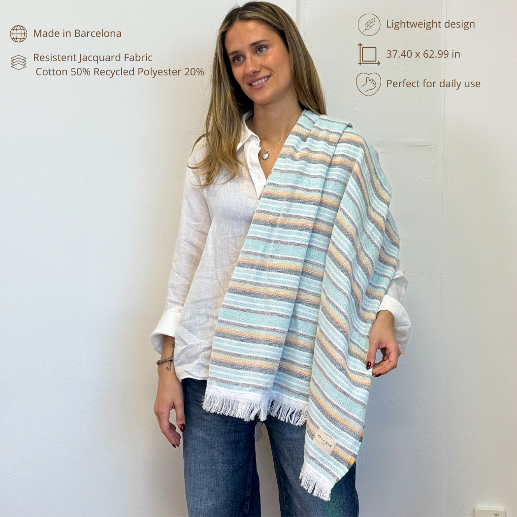 Multipurpose towel made from lightweight fabric (50% recycled cotton, 50% polyester) with fringed edges. Features a multicolor striped pattern. One size fits all. For proper care, it is recommended to wash in cold water and not tumble dry.